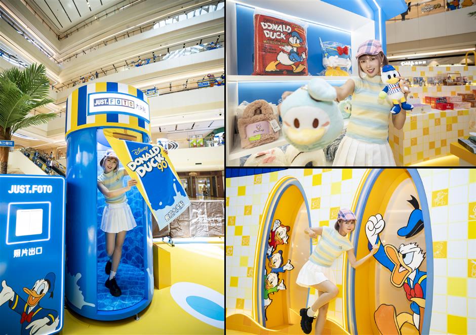 at the atrium on the lg2 floor, a three-meter-high donald duck sits in a pool, surrounded by palm trees, beach benches and other seaside elements. his giant bathtub has been moved to the outdoor square on the lg2 floor, awaiting visitors to have a fun bathroom party with him.