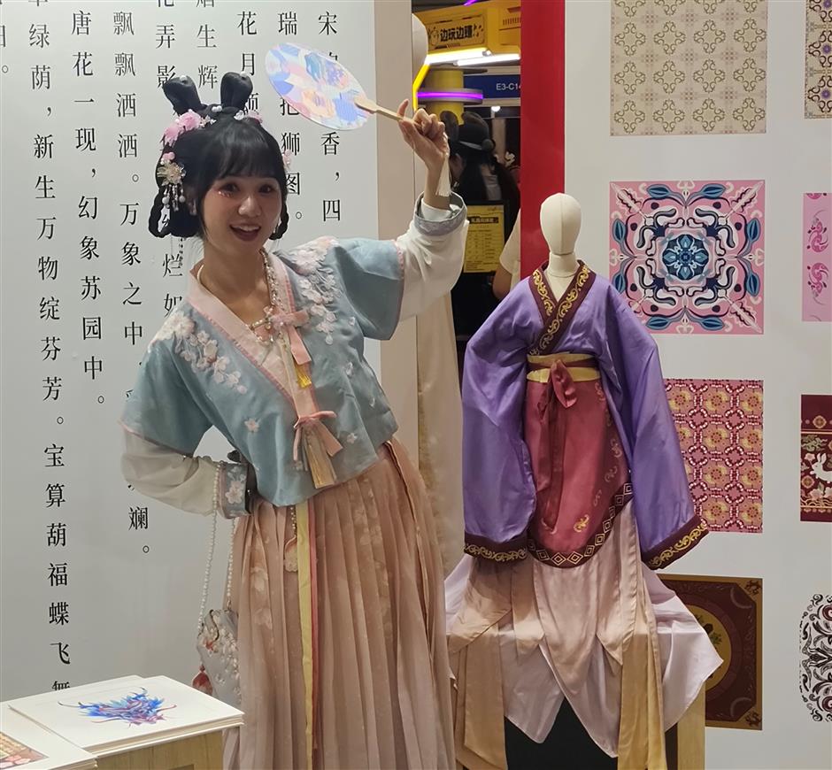 an exhibition of traditional chinese costumes and fabric patterns designed by students from 132 universities is going on at chinajoy 2023, attracting gamers and hanfu lovers.